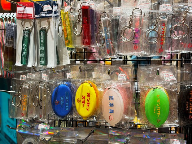 いろいろそろったアクリルキーホルダー。昔のホテルのルームキーのようなものからネオン看板のようなものまで。「オンセンスキー」「ミズブロスキー」「銭湯員」などちょっとクスッとできるものがいろいろありました。トートバッグもあって見るだけでも楽しいですよ。