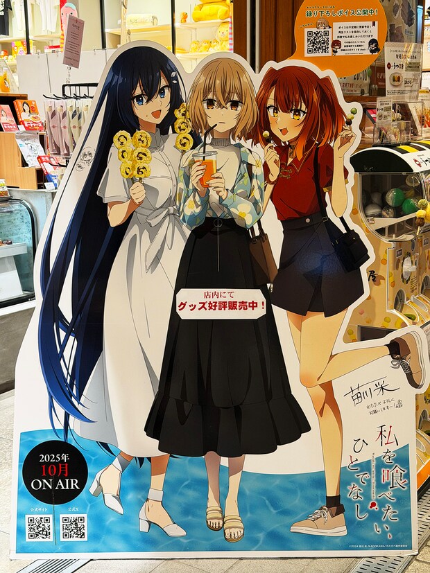 こちらは商店街の本館よりにあるお土産屋さん「十五万石MASARU」さんの店頭。愛媛県伊予市在住の苗川采さんが電撃マオウで連載中のコミックがアニメ化され、愛媛朝日テレビをはじめ全国ネットでオンエア中です!アニメのメインキャスト3人(左から近江汐莉(CV:石川由依)、八百歳比名子(CV:上田麗奈)、社美胡(CV:ファイルーズあい))の等身大パネルが展示されていました。