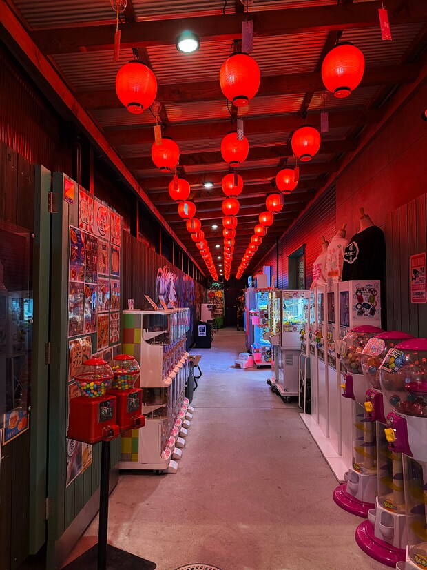 みんな大好きガチャコーナーがずらり!赤い提灯の灯りに照らされた小径をさらに進むと…