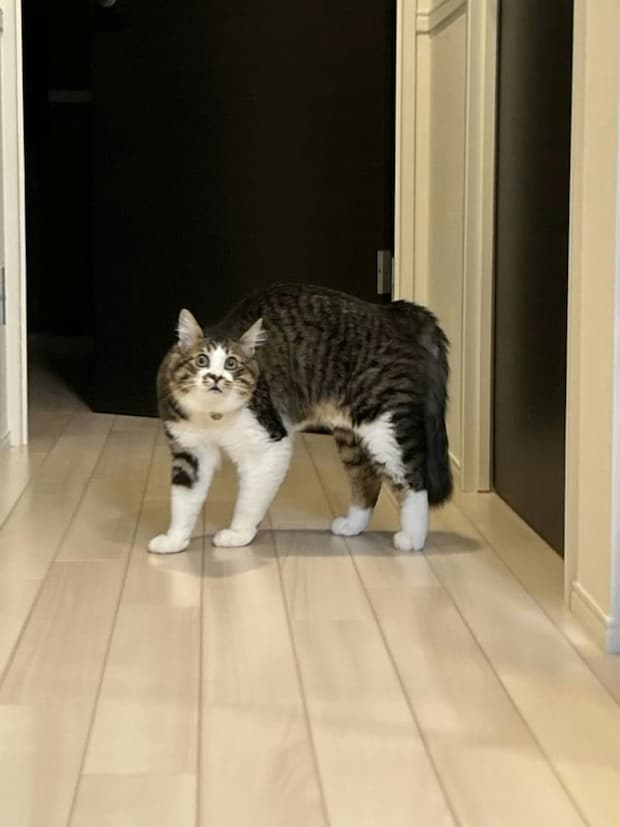 この投稿には「あまりにもかわいくて、この顔の絵(プリント)のグッズがほしい」「ドン引きしとるお顔」「目が点すぎる」など、猫好きさんのリプライが多数寄せられていました。