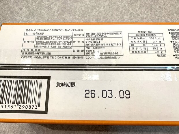価格は16個入り1,448円(税込)で、1個あたり約90円。バターの風味が豊かとのことで、プレーン味よりカロリーは高そうですが、意外にも1個あたり253kcalとほとんど同じです!