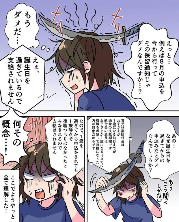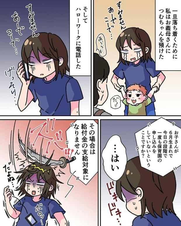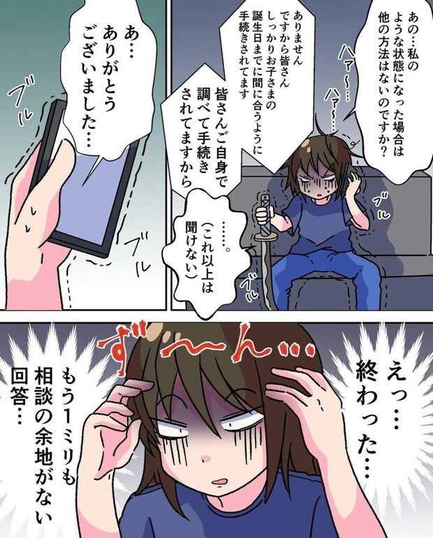 今度はハローワークへと電話をかけたみいのさん。しかし、そこで「育休の対象にはならない」と言われ、もうなす術がないことを悟ります。「みんな自分で調べて手続きをしている」という言葉はその通りなのですが、グサっときますよね。