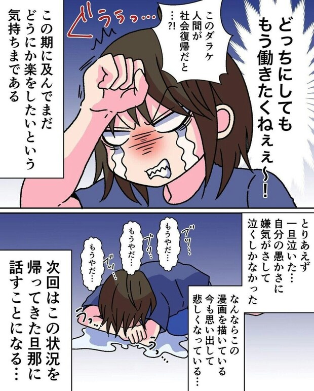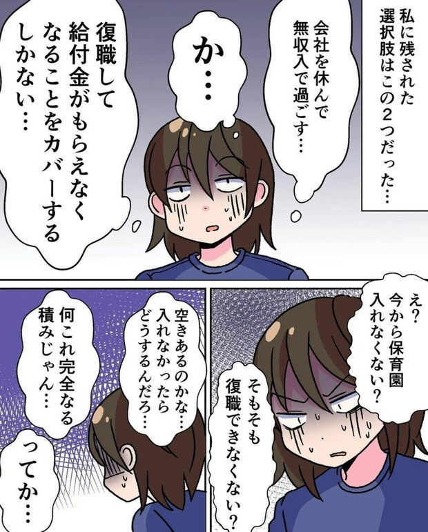 育休を延長できないことがわかったみいのさんに残された道は無収入で過ごすか、復職するかの二択になってしまいました。育休を延長するつもりでいたのに、あまりに突然のことで気持ちが追いついていない様子。復職するにしてもここから保育園を探すとなるとかなり忙しいスケジュールになりそうです…。