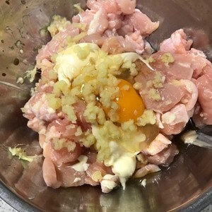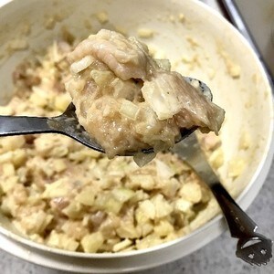 1. 1cm角に切った鶏むね肉に、レンチンしたじゃがいも、みじん切りにした玉ねぎを加えるのがポイント。粉類や調味料も加えます。
