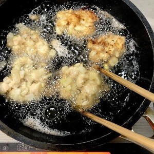 3. 油に投入したら固まるまで触らないのがコツ。両面を揚げ焼きにして、きつね色になったらできあがり!
