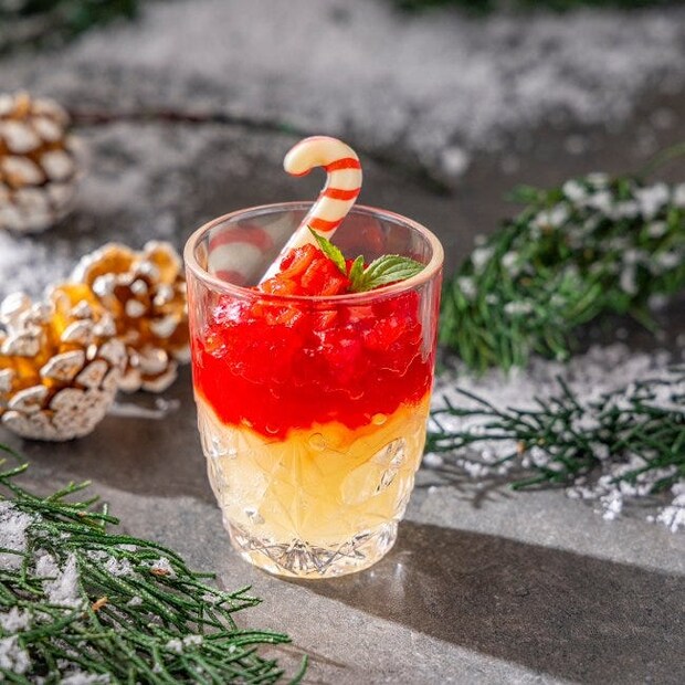 爽やかなマスカットゼリーと香り高く甘酸っぱいフランボワーズゼリーの2層仕立てで、色鮮やかな季節感あふれるゼリーもおすすめ。いちごのダイスとミントを飾り、フルーツの香りが漂うキラキラとしたゼリーでクリスマス気分を盛り上げよう。