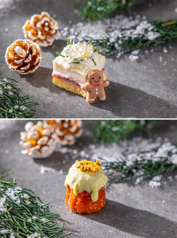 クリスマスリースのようなケーキに、雪山のような見た目のカヌレも