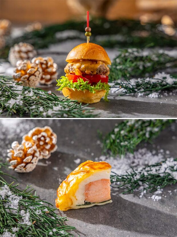 ホテル自慢のシグネチャーバーガーをひと口サイズで用意。ふんわりと香ばしいブリオッシュバンズに、ジューシーなシングルパテを挟み、レタスとトマトをトッピング。BBQソースの深みのある味わいが、パティのうまみをより引き立ててくれる。ホテルならではの味わいを堪能できる、食べ応え抜群のアイテムをいただこう。
