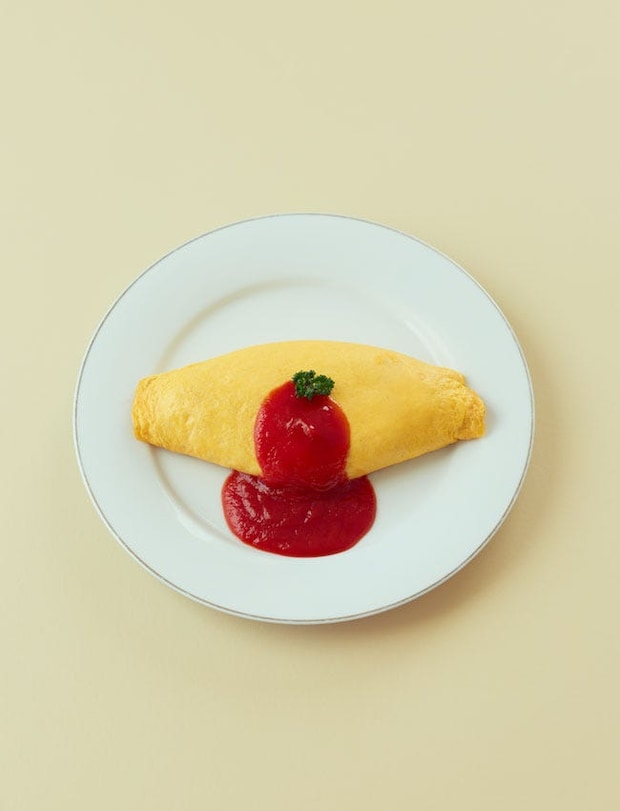 トマトソースで味付けしたチキンライスをボリュームのある卵で美しく巻いた三笠會館のオムライス クラッシックスタイル。崩すと中からごろりと鶏肉が。2700円