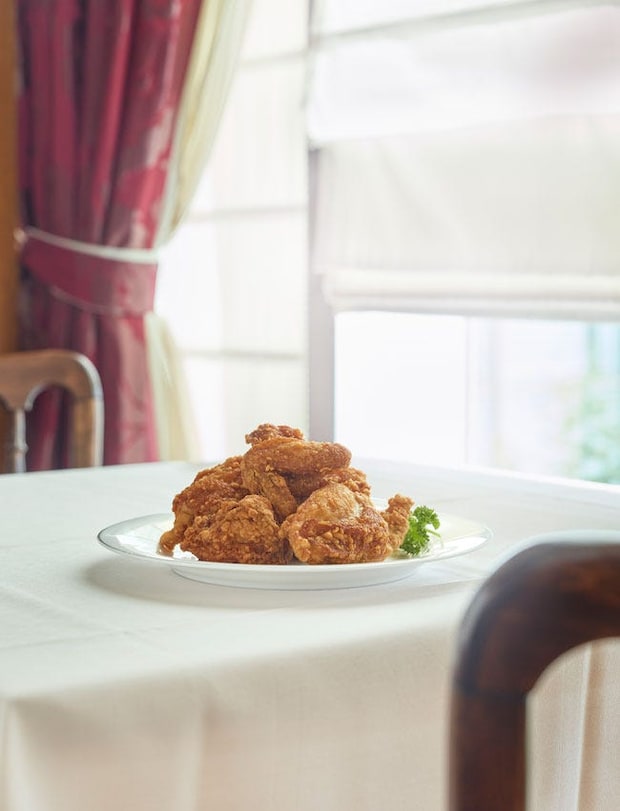 誕生は昭和7年、創業者の谷善之丞さんが、料理人たちとともに知恵を集めて生まれた、渾身の一品。こだわりは毎朝、丸鶏をさばくところから。薄口醤油と焼酎をベースに、胡麻油で香りを付けた特製ダレにからめ、二度揚げ。心そそるこうばしさ、音までおいしいパリッとした食感、ジューシーな鶏肉のうまみがほとばしる。