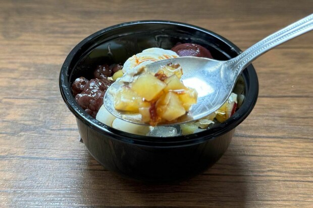 蓋を取り外すと、トッピングと下層の寒天が、黒蜜が分かれていました!