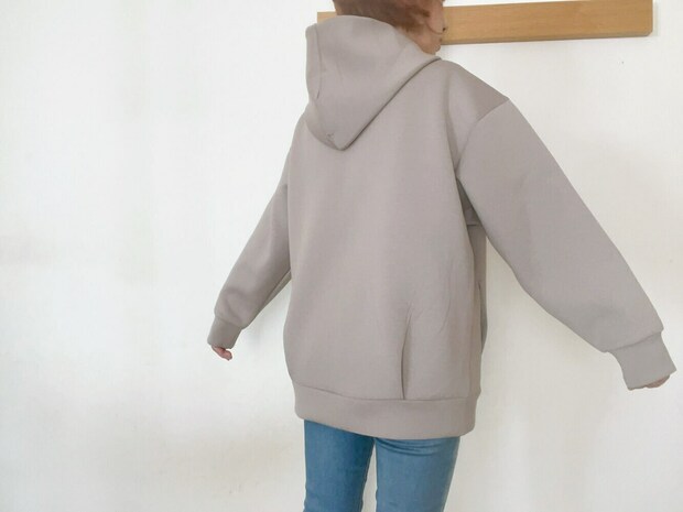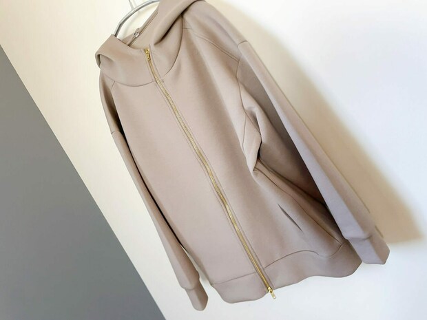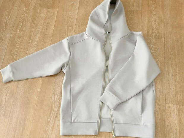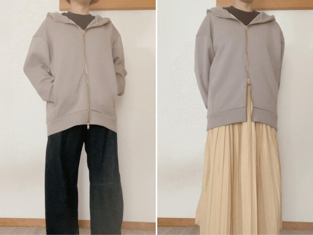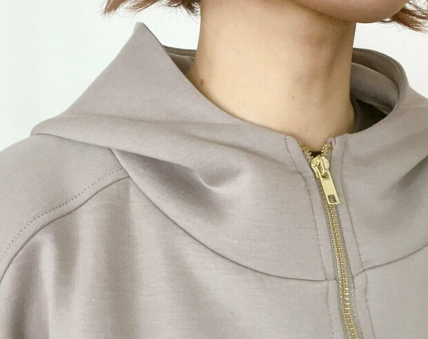 パーカーにありがちなフードの紐がないので、カジュアルになりすぎず上品さをプラス。