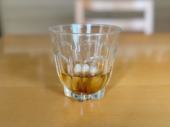 1. 氷を入れたグラスに、麦茶を30cc(大さじ2)入れます。