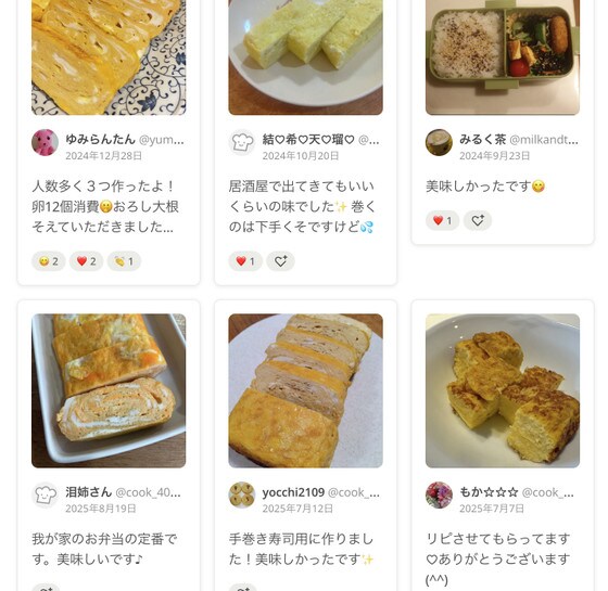 つくれぽには、チーズや海苔、ネギを入れたアレンジもありました。甘めでふっくら焼き上がる卵焼きは、できたてでも冷めてからでもおいしいのでお弁当のおかずや食卓の一品にぴったりですね。卵焼きとしてももちろん、ちらし寿司や手巻き寿司の材料としても甘めの味つけが相性抜群ですので、家にめんつゆがある人は試してみる価値ありですよ。(TEXT:青木千奈)