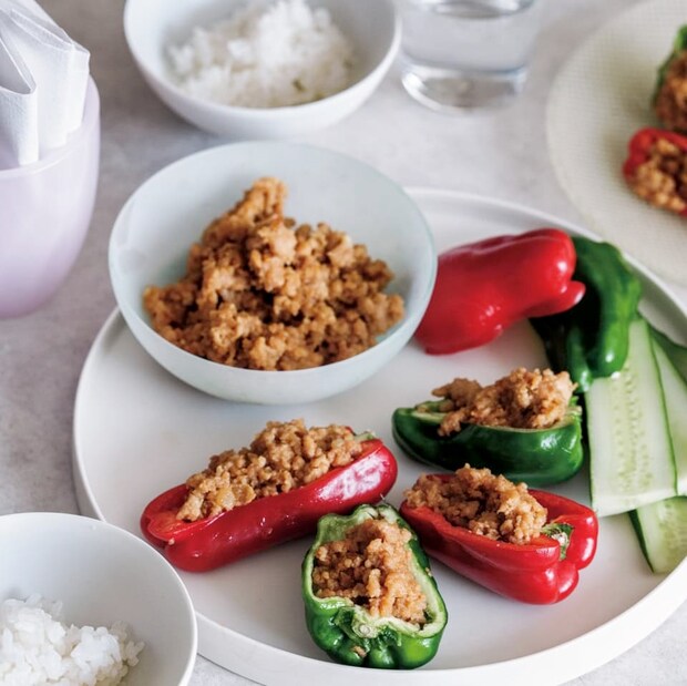 ④ ❷、❸、ごはんを器に盛り、食べるときにピーマンに❷を詰める。