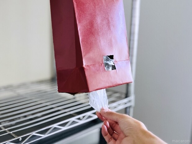 底からサッとポリ袋を取り出せますよ。ポリ袋ではなく、大きめのビニール袋を入れても同じようにできます。