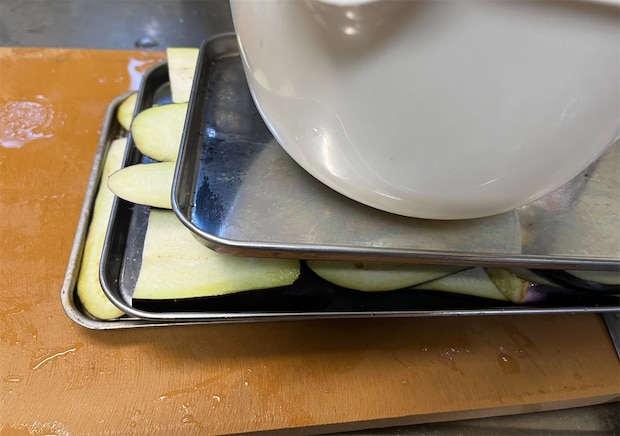 2. 1のなすをバットに並べ、塩を振ってから重石をし、10分ほど置いてアク抜きする。