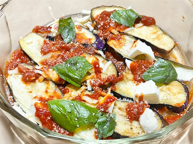 8. 耐熱容器に、少量のトマトソースを広げ、その上に1/3量のなす、モッツァレラチーズ、トマトソース、バジルの葉、パルメザンチーズの順に重ねる。これをあと2回繰り返す。