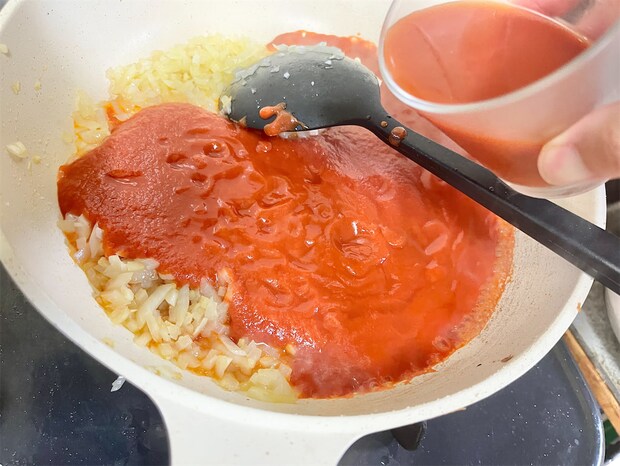 トマトパック…500ml(ホールトマトの水煮缶をミキサーにかけたものや、トマトピューレ、トマトジュースでもトマトを裏ごししたものならOK)