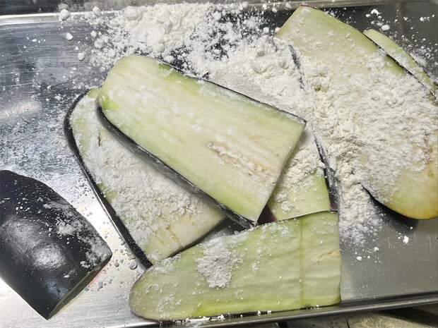 5. フライパンに揚げ油(分量外)を入れ、中火で170℃になるまで熱し、4のなすをこんがり色づくまで揚げる。
