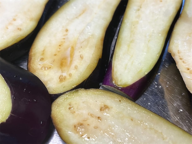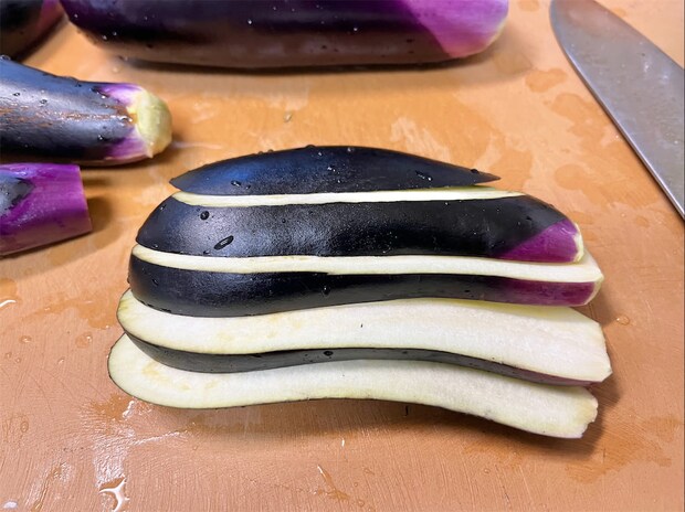 大きめのなすは、輪切りにしてもOK。輪切りの場合も5〜6mmほどの厚さに切ってください。