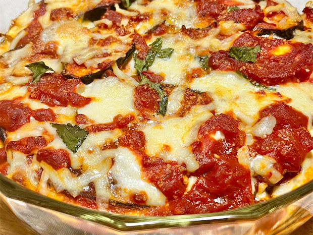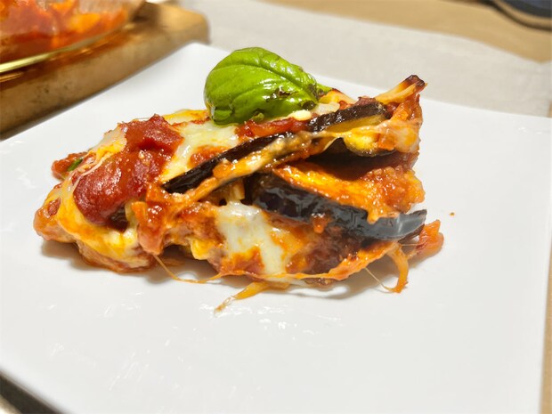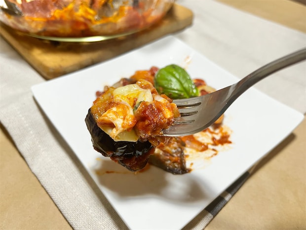 熱々を頬ばると、柔らかくジューシーななすとコクのあるトマトソース、こんがり焼けたチーズのハーモニーがおいしい!