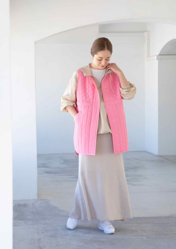 「アノラックパーカとキルティングベストのレイヤードを、ナローシルエットのスカートに合わせて女性らしさのあるカジュアルスタイルに仕上げました。キルティングベストのピンクが柔らかなベージュトーンのスパイスに。カジュアルだけど、ラフ過ぎないコーデが気に入っています」