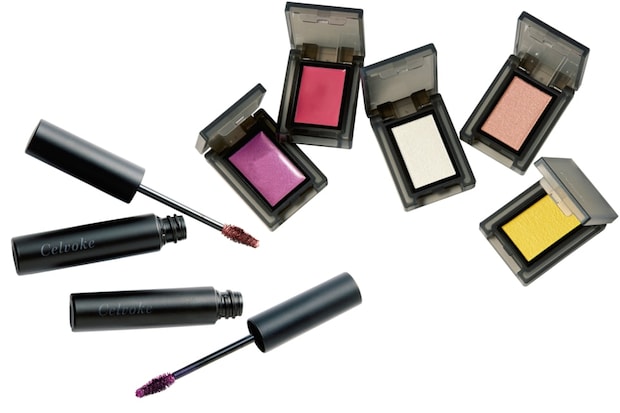 右上:絶妙な煌めきで、目元にニュアンスをプラス。重ねてもカワイイ。左からヴォランタリー アイズ EX14、EX15、EX16、34、36 各¥2,200 ※EX14〜16は数量限定、左下:ヌケ感をもたらすパープル系のアイブロウマスカラ。上からインディケイト アイブロウマスカラ C 03、04 各¥3,080(全てセルヴォーク)