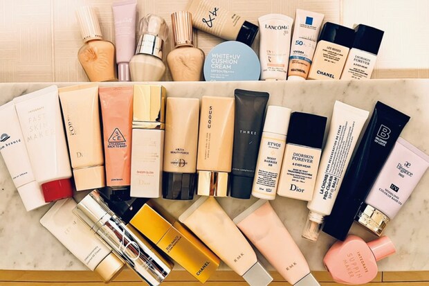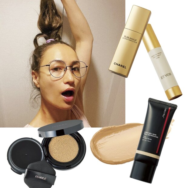 「大人のベースメイクは下地で決まる! といっても過言じゃないです。肌のくすみを飛ばし自然にトーンアップしながら、上品なツヤをもたらしてくれる下地が好きで、コレクションしていたらこんなに大量に……。上に重ねるファンデーションもカバー力よりツヤ感重視。光を味方につけることで肌にハリ感が出て、フレッシュに見えます。最近は下地を混ぜて使うテクも修得」