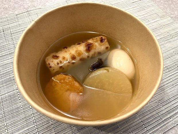 熱々の状態で提供されるため寒い季節に最適で、大きな容器の中には大根、ちくわ、たまご、さつま揚げ、こんにゃく、昆布という6種類の具材が入っています。
