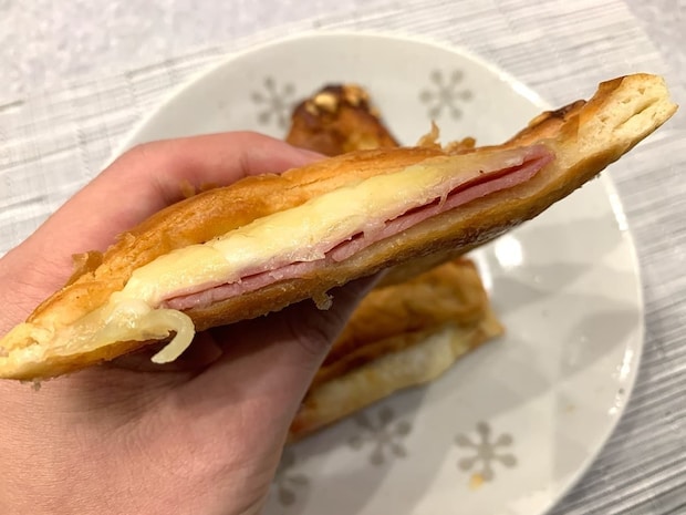 クロワッサン生地でハムとチーズを挟んで焼き上げた「クロワッサンハム&チーズ」。