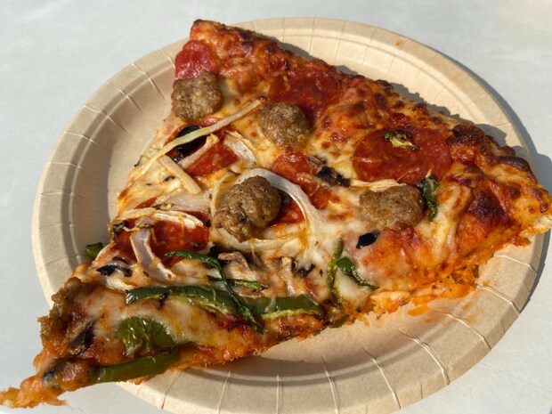 写真は「コンボ」で、もちもちとした生地に、肉や野菜が具沢山。1ピースでも満足度の高いピザです。