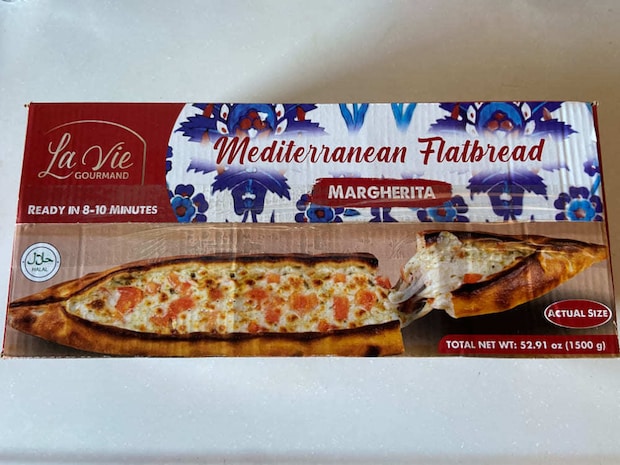 箱に記載されている調理方法によると、はじめにオーブンを232度に予熱します。次に、凍ったままのフラットブレッドを袋から取り出して天板に並べ、7~9分焼く、とできあがり。