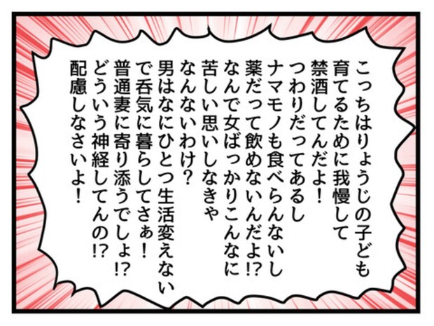 キリコさんが妊娠してからお酒を我慢していた夫りょうじさん。ワインを買って帰ってきたらなんで買ってきたの?とキリコさんからの猛攻撃。私は飲めないのに配慮が足りない!と怒るキリコさんについにりょうじさんがキレる?
