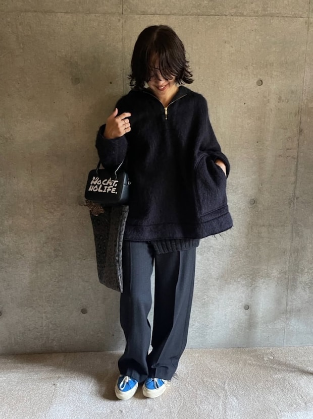 「ブルーのスニーカーを主役に、他はトーンを整えてシックにまとめました。ワントーンでもベタっとしないよう、スニーカーやシャギーウールのプルオーバーで素材感に遊びを入れたのがポイント。プルオーバーはオーバーサイズでたっぷりとした着用感で、どんなボトムスとも好相性なのも魅力です!」