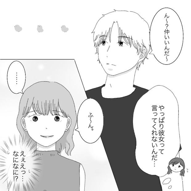 女の子の質問に、レンは「ん~?仲いいんだ~」とはぐらかすように答えます。やっぱり彼女って言ってくれないんだ・・・分かっていたことだけど、あらためて言われると悲しい気持ちになりました。女の子は少し間を置いて「ふ~ん」と何か言いたげな様子。含みを持たせた返答に、私はさらに不安になりました。