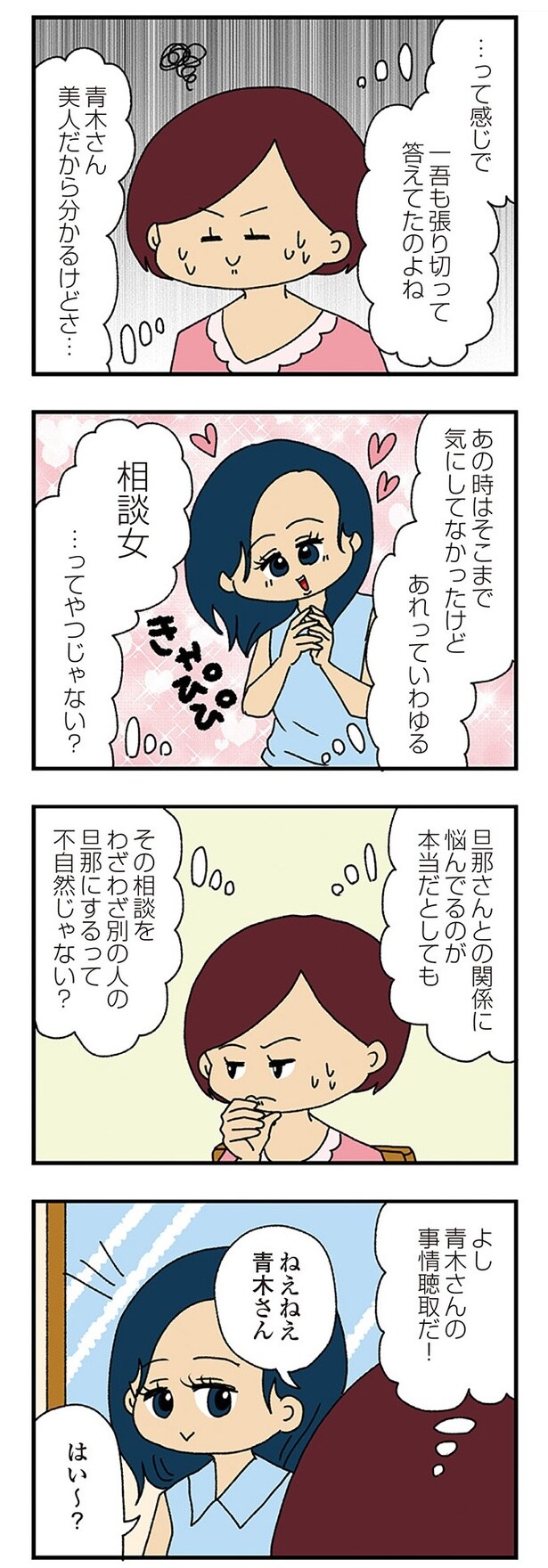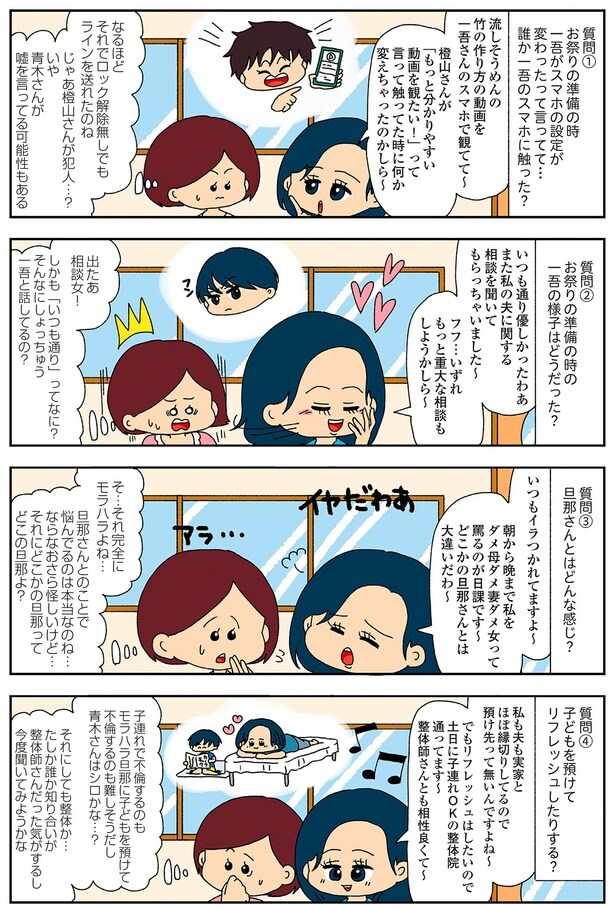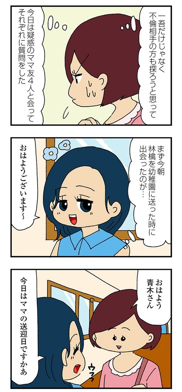 前回、ママ友達とのキャンプまでに夫の不倫相手を突き止めようと決意したなつめ。まずは小型発信機を一吾のスーツに仕込むことにした。次になつめは、怪しい4人のママ友ひとりずつに質問をすることに…。