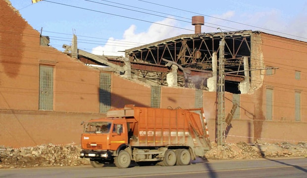 写真説明:隕石による衝撃波を受け、壁や屋根が大破したチェリャビンスクの亜鉛工場(2013年2月16日、緒方賢一撮影)