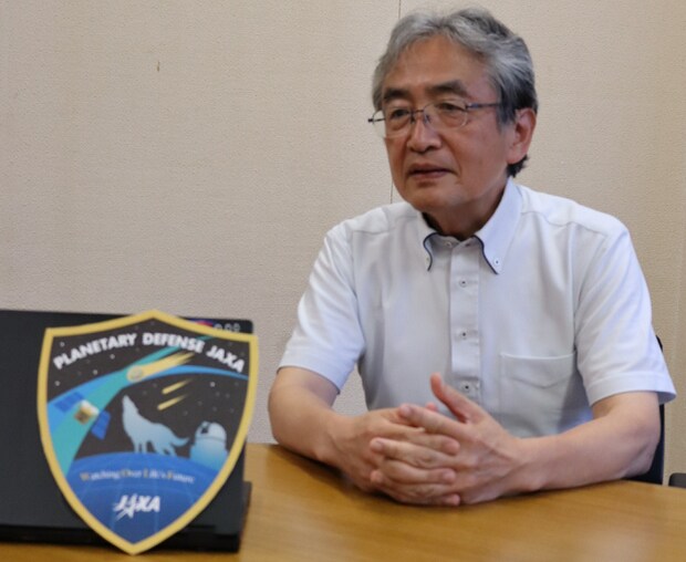 写真説明:インタビューに答える吉川さん。手前はJAXAが作成したプラネタリーディフェンスのロゴマーク(相模原市のJAXA宇宙科学研究所で)