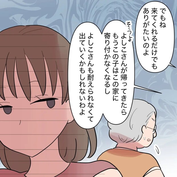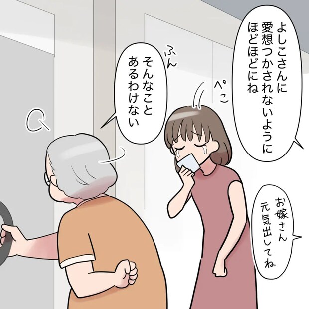 「よしこさんに愛想つかされないように、ほどほどにね。」「お嫁さん、元気出してね。」などと言われながら、義祖母は「ふん、そんあことあるわけない」と言いつつバツが悪そうに家に入っていきました。