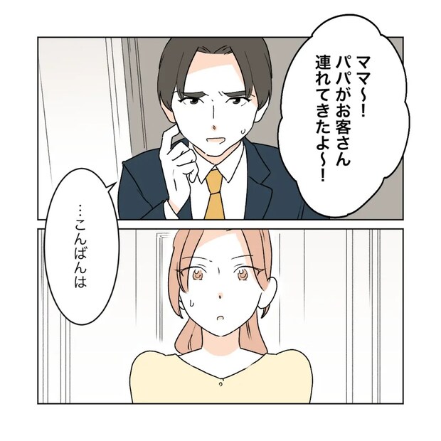 ショウマに声をかけられて、動揺しながらもカエデの家に入ったワタル。ナズナに「ママ~!パパがお客さん連れてきたよ~!」と声をかけられて玄関に出てきたサクラは、「こんばんは」とばつの悪そうなワタルの姿を見て固まりました。