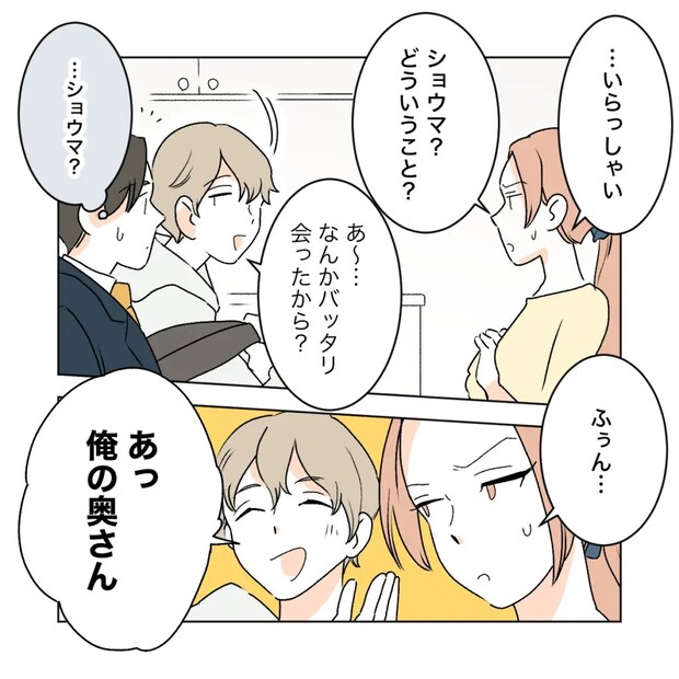 ワタルに「いらっしゃい」と答えながらも「ショウマ?どういうこと?」と笑わないサクラ。カエデの家から出てきた女性がショウマを呼び捨てにする状況がイマイチ分からないワタルにショウマが「俺の奥さん」と紹介しました。