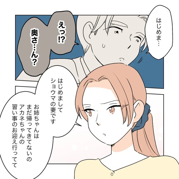 ショウマがカエデの家に帰ってきて、奥さんと娘がカエデの家に居て・・・?まだ状況が呑み込めないワタルに「はじめましてショウマの妻です。お姉ちゃんはまだ帰って来てないの。アカネちゃんの習い事のお迎え行ってて。」とサクラが言いました。