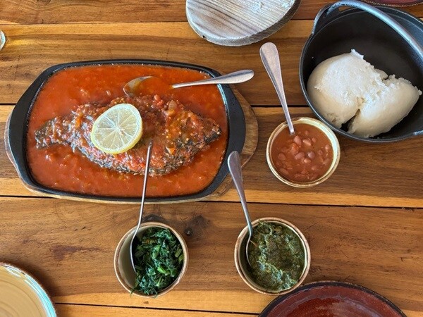 ザンビアの主食シマと魚のフライ、付け合わせ