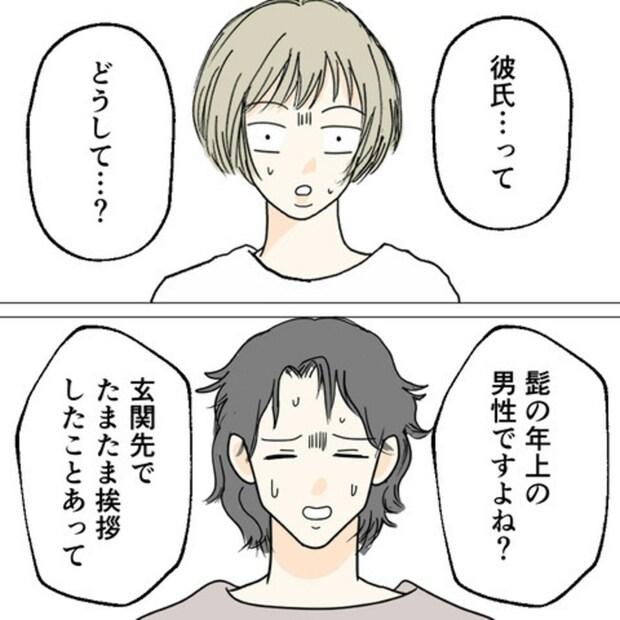 E原さんはS葉さんを怖がらせるつもりは全くない様子です。そんなE原さんから「彼氏」という言葉が飛び出し、S葉さんは驚きます。E原さんが見た男性はおそらくM生のことでしょう。