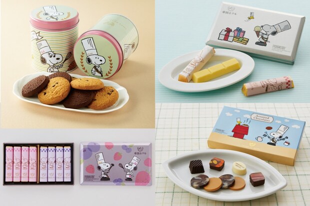 右上から時計回りに:料理長スヌーピー スティックアソート¥1,728、料理長スヌーピー バラエティボックス¥1,404、パティシエール ベルスティックアソート¥1,728、料理長スヌーピー クッキー詰め合わせ¥1,620、(全て帝国ホテル 東京)