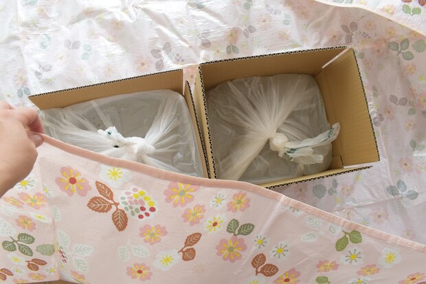 設置したい場所のサイズ(ドアの間口の幅など)に合わせて段ボールを複数個用意し、それぞれの中に水のうを詰めます。全体をブルーシートやレジャーシートで包みます。