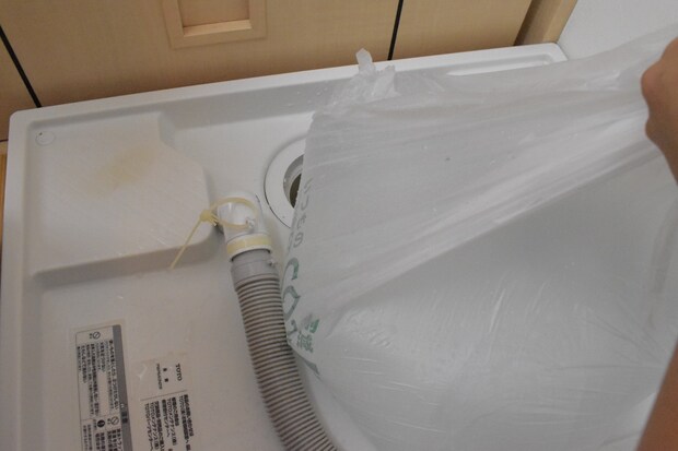 洗濯機は排水のホースを引き抜いてから、排水口を完全に隠すように水のうを置きます。