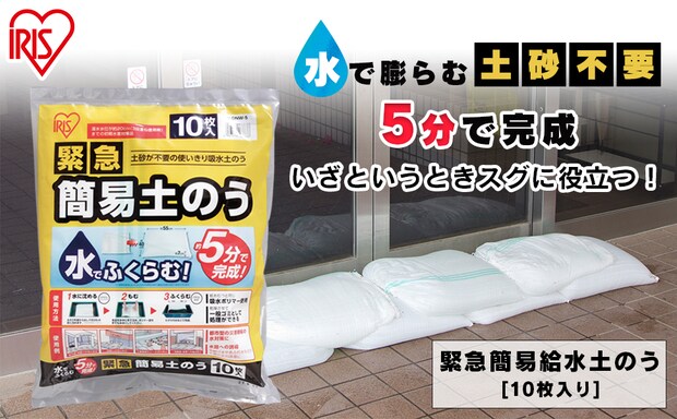 自分で水を詰めて水のうを作ることもできますが、水で膨らむタイプの「簡易土のう」が市販されています。