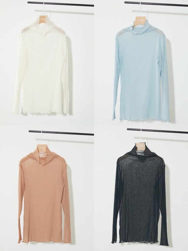 希少な編み機で作られた透け感のある楊柳風ジャージは、軽さと表情感を融合させた布帛見えのカットソー。メッシュ素材で程よい透け感があり、インナーとして重ね着にしても◎。行者さんの着ているイエローを含め、全5色。メッシュハイネックトップス各¥9,900(全てブラック バイ マウジー)